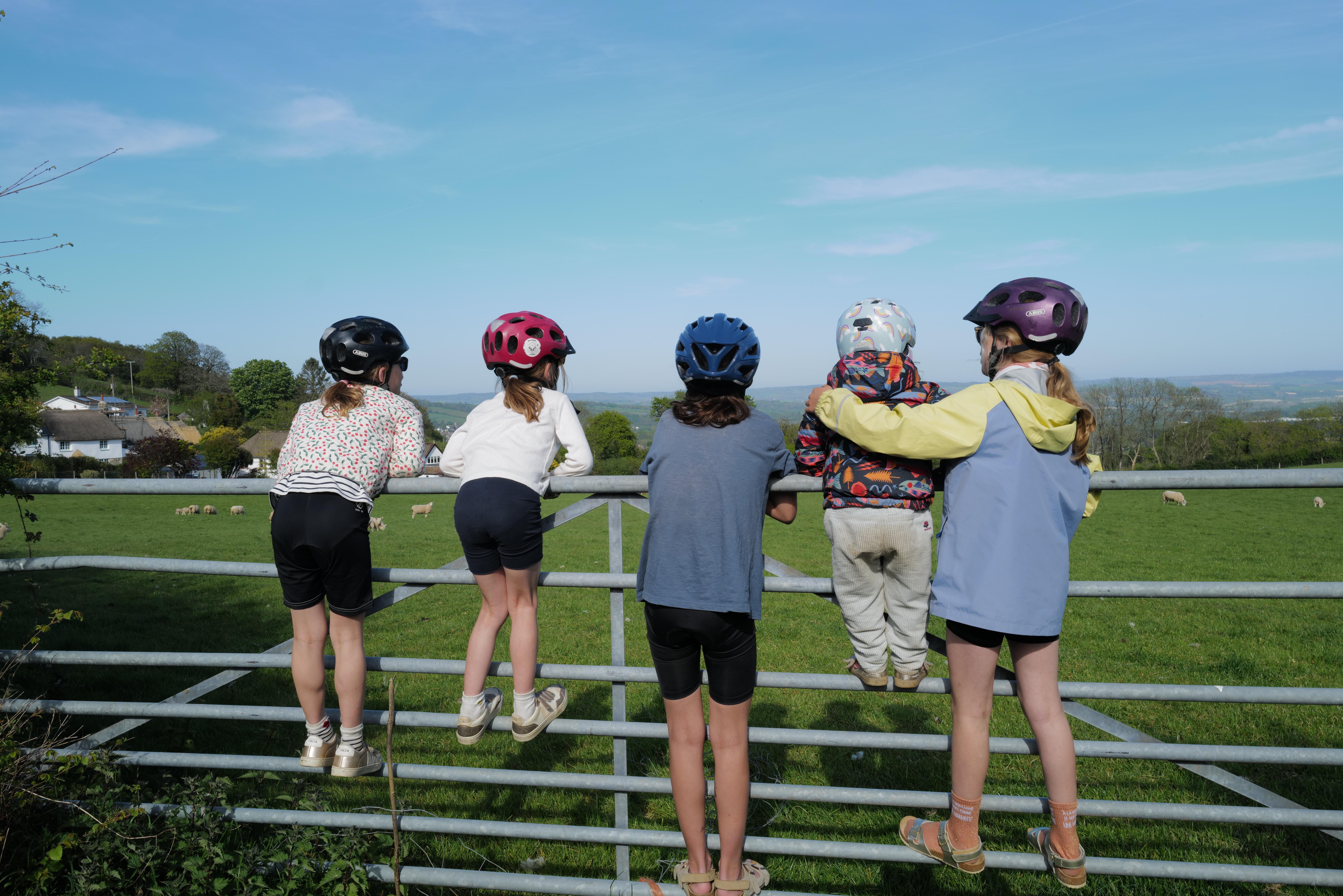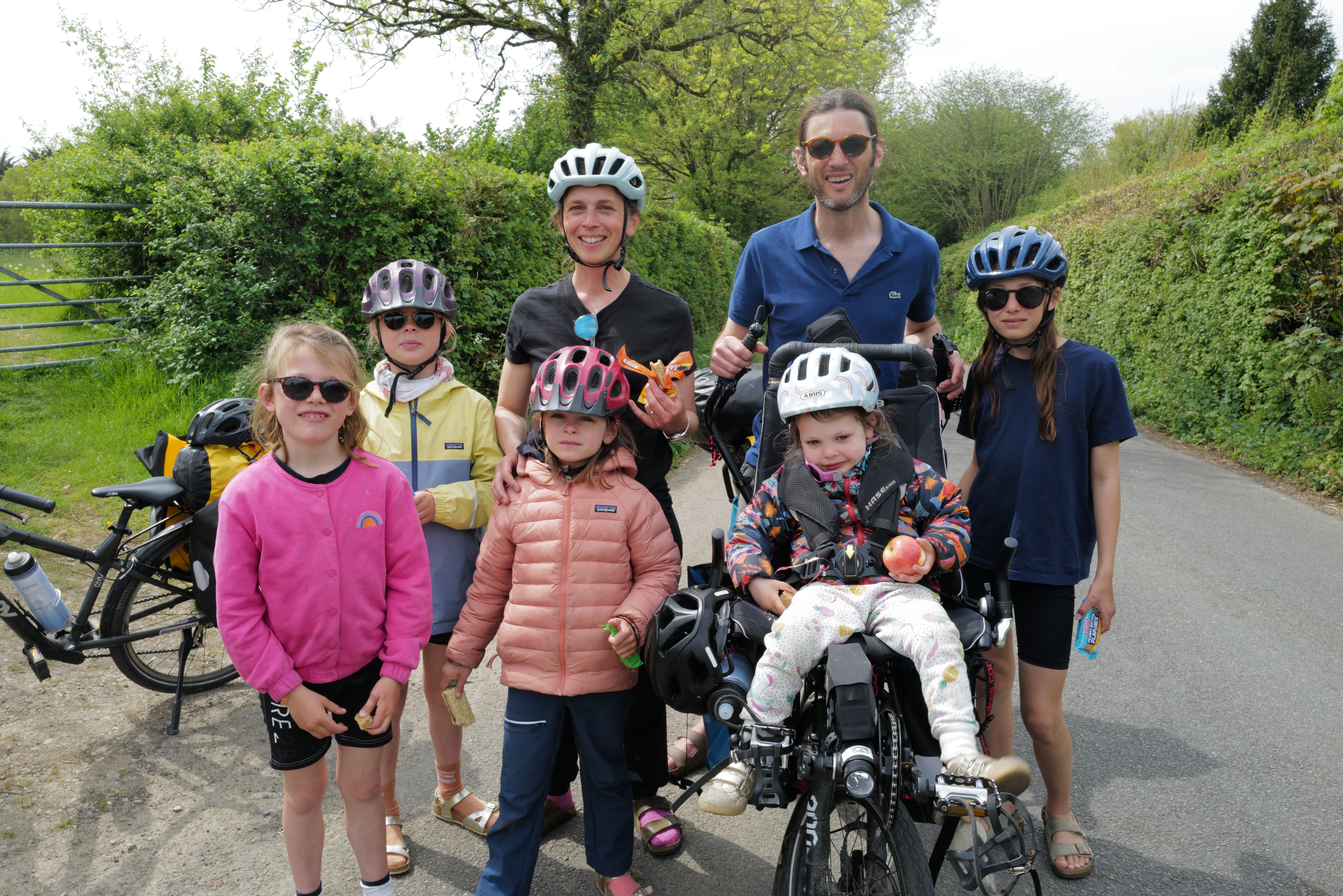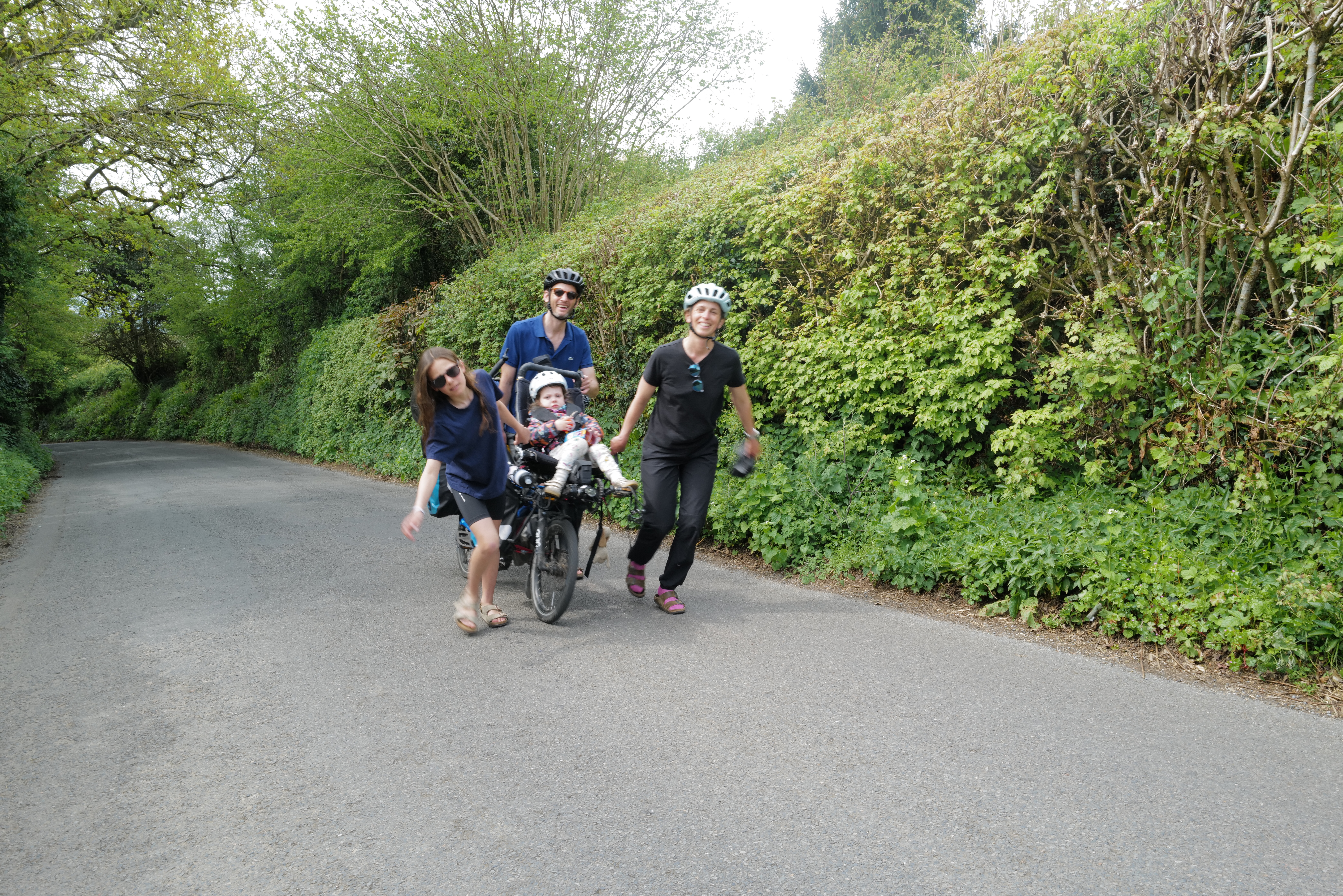 Nous sommes arrivés à Plymouth le lundi 20 avril au soir. Une journée d’acclimatation, de lessive et d’école et c’est parti pour notre aventure au pays de Shakespeare et de Dua Lipa. Une première semaine à travers le Devon comme un enchantement : petites routes de campagne sous le soleil, paysages de cartes postales avec grandes prairies vallonnées parsemées de moutons, régulièrement petits manoirs ou cottages cossus super bien entretenus comme dans Raison et Sentiments, on se croit dans le monde de Jane Austen. On n’avance pas vite, justement parce que dans le Devon ce n’est jamais plat, jamais des grosses montées ni des grosses descentes mais toujours quelque chose. Comme pour les cottages, les filles jouent à donner des petits sobriquets aux montées : on a la côte « routale » (route partagée avec des voiture), la côte sandwich (quand les parents vous promettent le pique nique en haut de la côte), la côte inutile (lorsque la descente qui suit équivaut à la montée qui vient d’être faite), et bien sûr la côte de la mort qui à la fin s’appelle la côte de la mort qui tue. Nous avons aussi la descente frisquette (celle qui donne froid parce que ça va trop vite). Ça joue pas mal des vitesses et ça déraille aussi . Quand les montées sont trop hard il faut pousser les vélos à plusieurs, à pieds (celles-ci se prénomment la côte manuelle) et là ça râle, mais beaucoup moins qu’au début du voyage. Les filles s’adaptent très bien à ces nouvelles contraintes. Dans l’ensemble on fait des sorties de 20-25 km par jour car ces côtes que nous devons monter à pieds ralentissent le rythme.