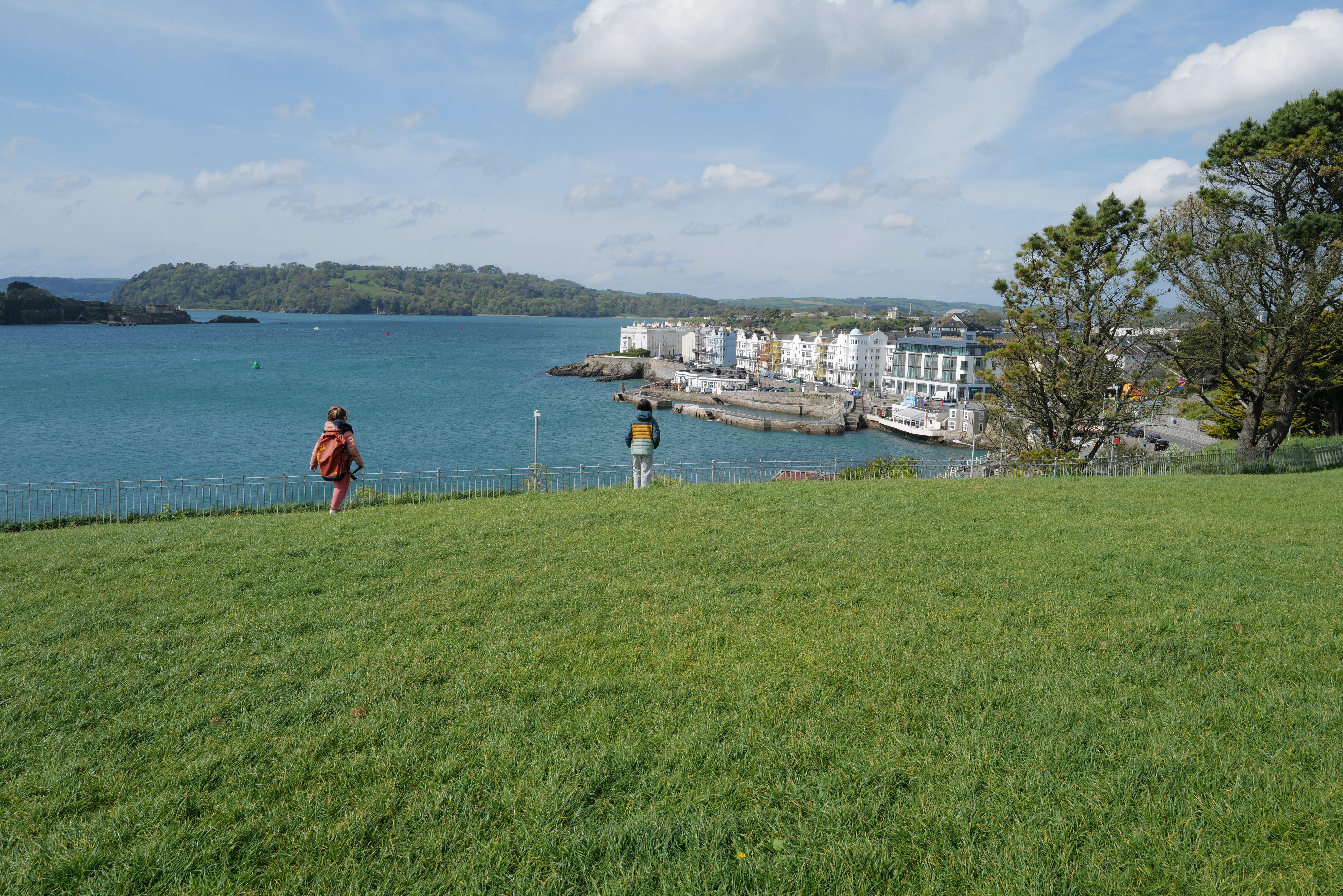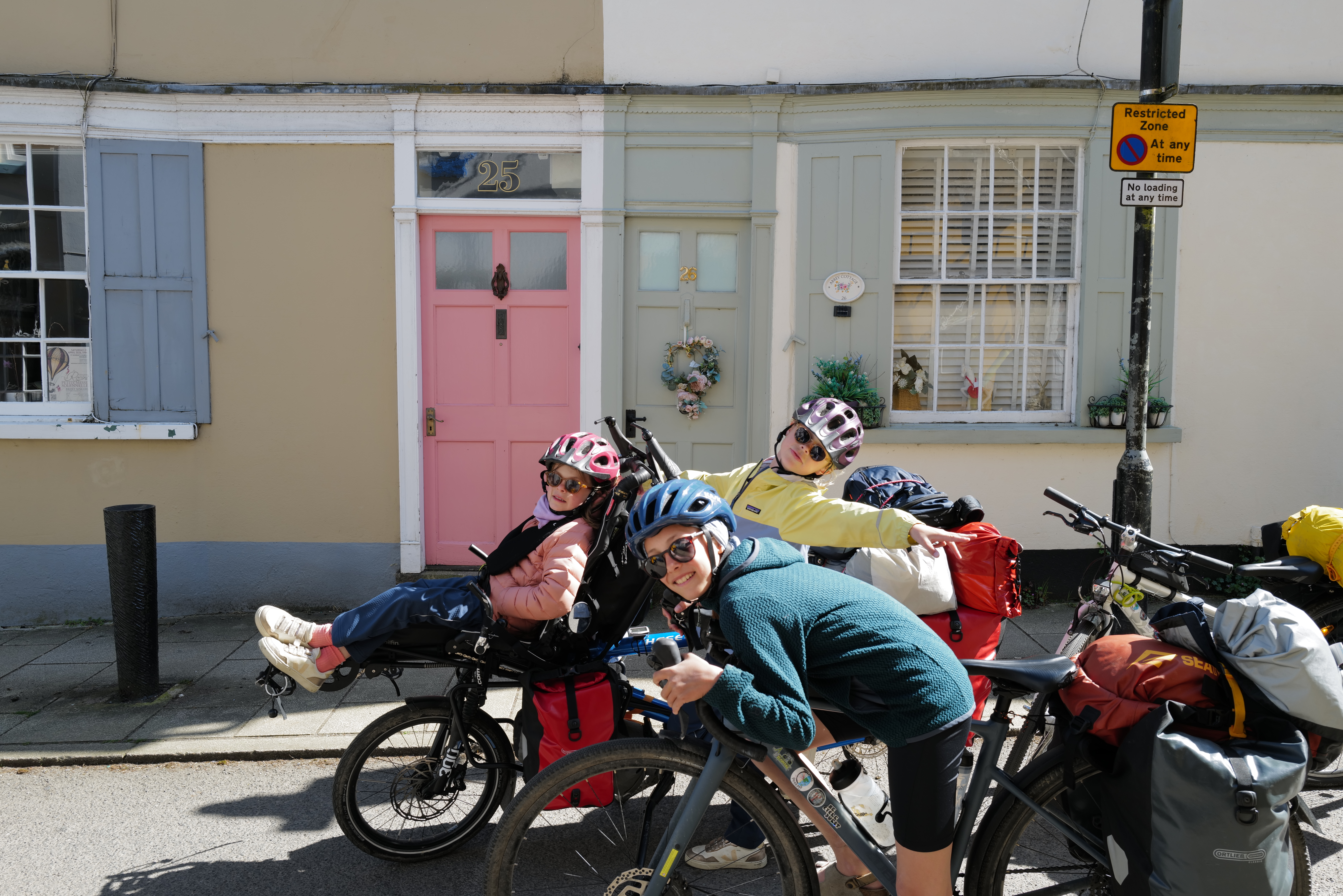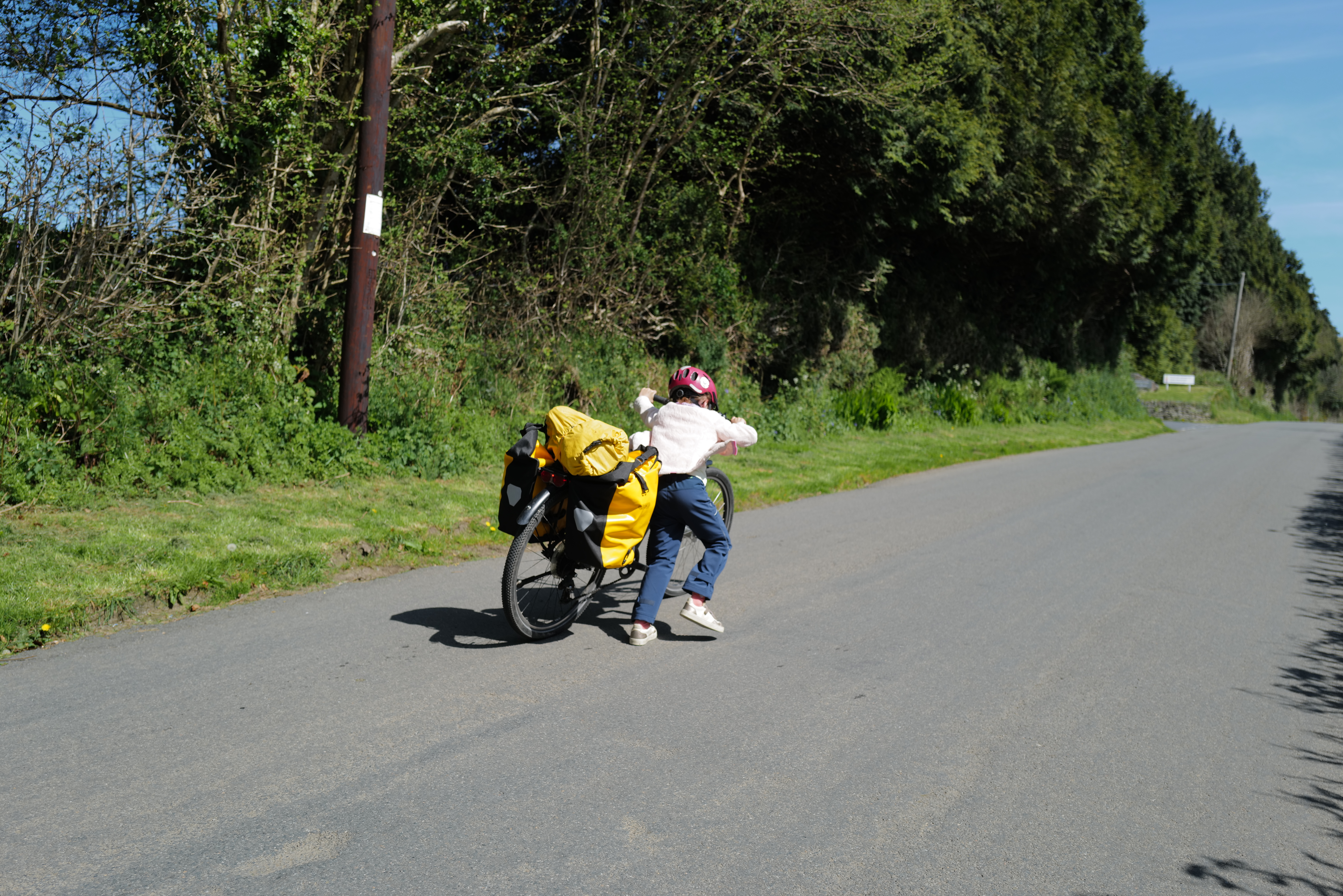 Nous sommes arrivés à Plymouth le lundi 20 avril au soir. Une journée d’acclimatation, de lessive et d’école et c’est parti pour notre aventure au pays de Shakespeare et de Dua Lipa. Une première semaine à travers le Devon comme un enchantement : petites routes de campagne sous le soleil, paysages de cartes postales avec grandes prairies vallonnées parsemées de moutons, régulièrement petits manoirs ou cottages cossus super bien entretenus comme dans Raison et Sentiments, on se croit dans le monde de Jane Austen. On n’avance pas vite, justement parce que dans le Devon ce n’est jamais plat, jamais des grosses montées ni des grosses descentes mais toujours quelque chose. Comme pour les cottages, les filles jouent à donner des petits sobriquets aux montées : on a la côte « routale » (route partagée avec des voiture), la côte sandwich (quand les parents vous promettent le pique nique en haut de la côte), la côte inutile (lorsque la descente qui suit équivaut à la montée qui vient d’être faite), et bien sûr la côte de la mort qui à la fin s’appelle la côte de la mort qui tue. Nous avons aussi la descente frisquette (celle qui donne froid parce que ça va trop vite). Ça joue pas mal des vitesses et ça déraille aussi . Quand les montées sont trop hard il faut pousser les vélos à plusieurs, à pieds (celles-ci se prénomment la côte manuelle) et là ça râle, mais beaucoup moins qu’au début du voyage. Les filles s’adaptent très bien à ces nouvelles contraintes. Dans l’ensemble on fait des sorties de 20-25 km par jour car ces côtes que nous devons monter à pieds ralentissent le rythme.