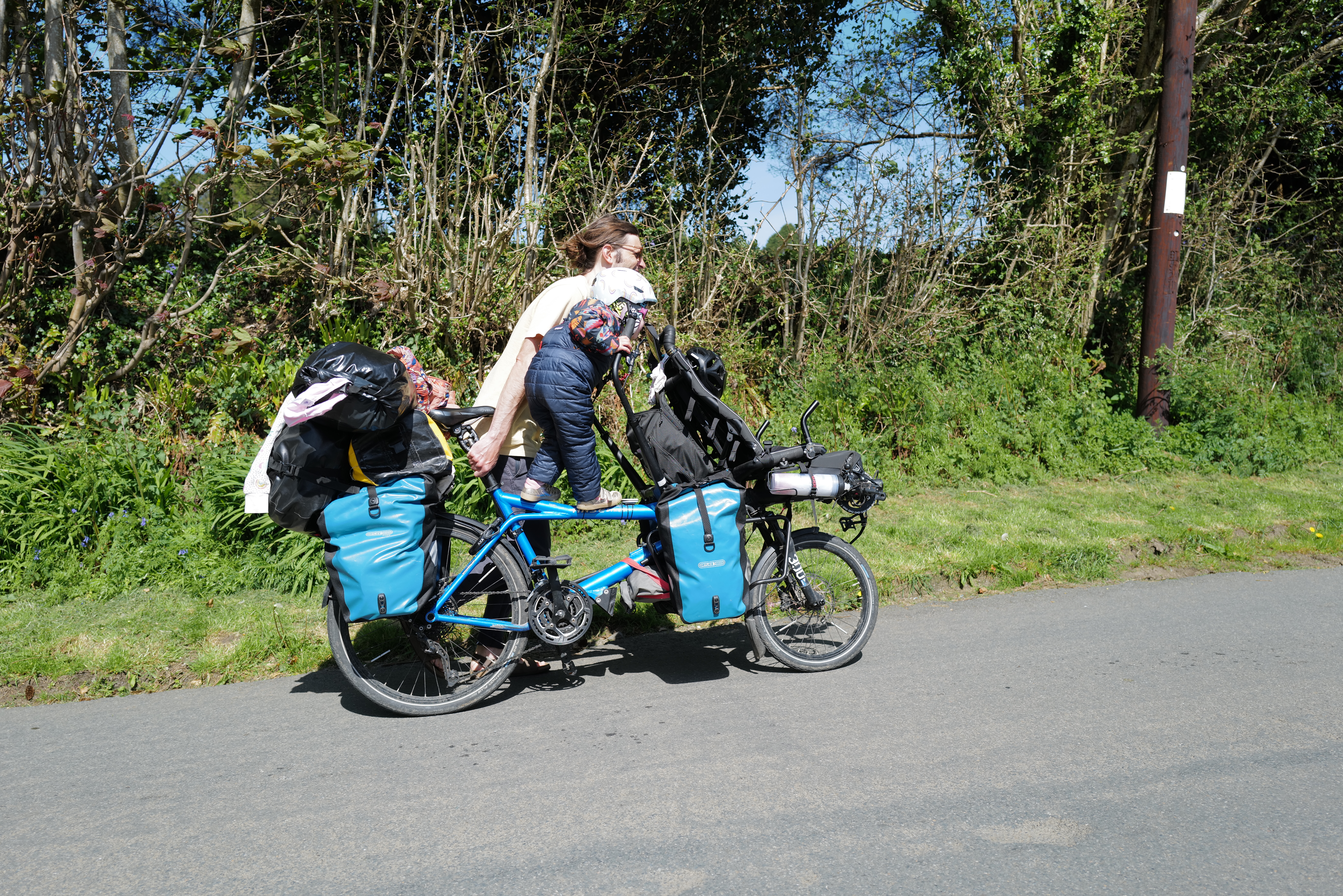 C’est marrant, car au final nous ne sommes pas si loin de la Bretagne, climat et nature sont assez similaires et pourtant ici tout est différent : on roule à gauche, on compte en miles, on paye en livre sterling, des supermarchés organisés complètement différemment pour vendre bien sûr des trucs différents, il ne faut pas oublier d’allumer l’interrupteur en face de la prise si on veut que ça marche… Comme dans un thé, lentement, on infuse ce nouveau style de vie et par le voyage en vélo ça se fait tranquillement mais au coeur du sujet. Le porridge débarque au petit déjeuner et Maxime (il n’y a qu’elle !) apprécie les fruits en gelée. Il faut absolument parler de Warmshowers car cette application nous a permis de faire des supers rencontres : le principe est simple, cette application met en relation des cyclovoyageurs, on localise sur l’application un membre sur notre route, on se présente et on lui demande s’il est possible de poser notre tente dans son jardin et si on peut utiliser les toilettes et prendre une douche chaude évidemment ! Merci donc à tous ces bons samaritains qui nous ont ouvert la porte de chez eux. Très souvent, on nous offre bien plus, un dîner tout prêt, un petit dej le lendemain et même une fois une balade en voiture au coucher du soleil au sommet du Dartmoor, ce magnifique parc national montagneux que nous n’aurions pas pu monter à vélo avec notre troupe. Mais encore donner des conseils et aider à réparer la béquille d’un des tandems ! Une opportunité extraordinaire de voir comment les anglais vivent chez eux et comment ce qui nous semble saugrenu à priori, est en fait bien sensé. Bon, on n’a toujours pas compris pourquoi il y a une bassine énorme qui occupe toute la place de l’évier de la cuisine… En tous cas c’est certain que lorsqu’on sera rentrés chez nous, notre maison sera the place to be a « Warmshowers ».